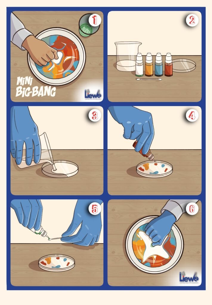La leche tiene grasa y el jabón rompe esa grasa. Cuando el cotonete con jabón toca la leche, empuja las moléculas y hace que los colores se muevan rápidamente en todas direcciones, creando formas y “explosiones” de color. Esto se puede comparar con el Big Bang. Hace muchísimo tiempo, toda la materia del universo estaba concentrada en un solo punto muy pequeño. De repente, comenzó a expandirse hacia afuera en todas direcciones. En este experimento, los colores representan la materia del universo, y el movimiento que ves es como esa expansión. No es una explosión como tal, sino un proceso donde todo se va separando y ocupando más espacio, igual que los colores en la leche.